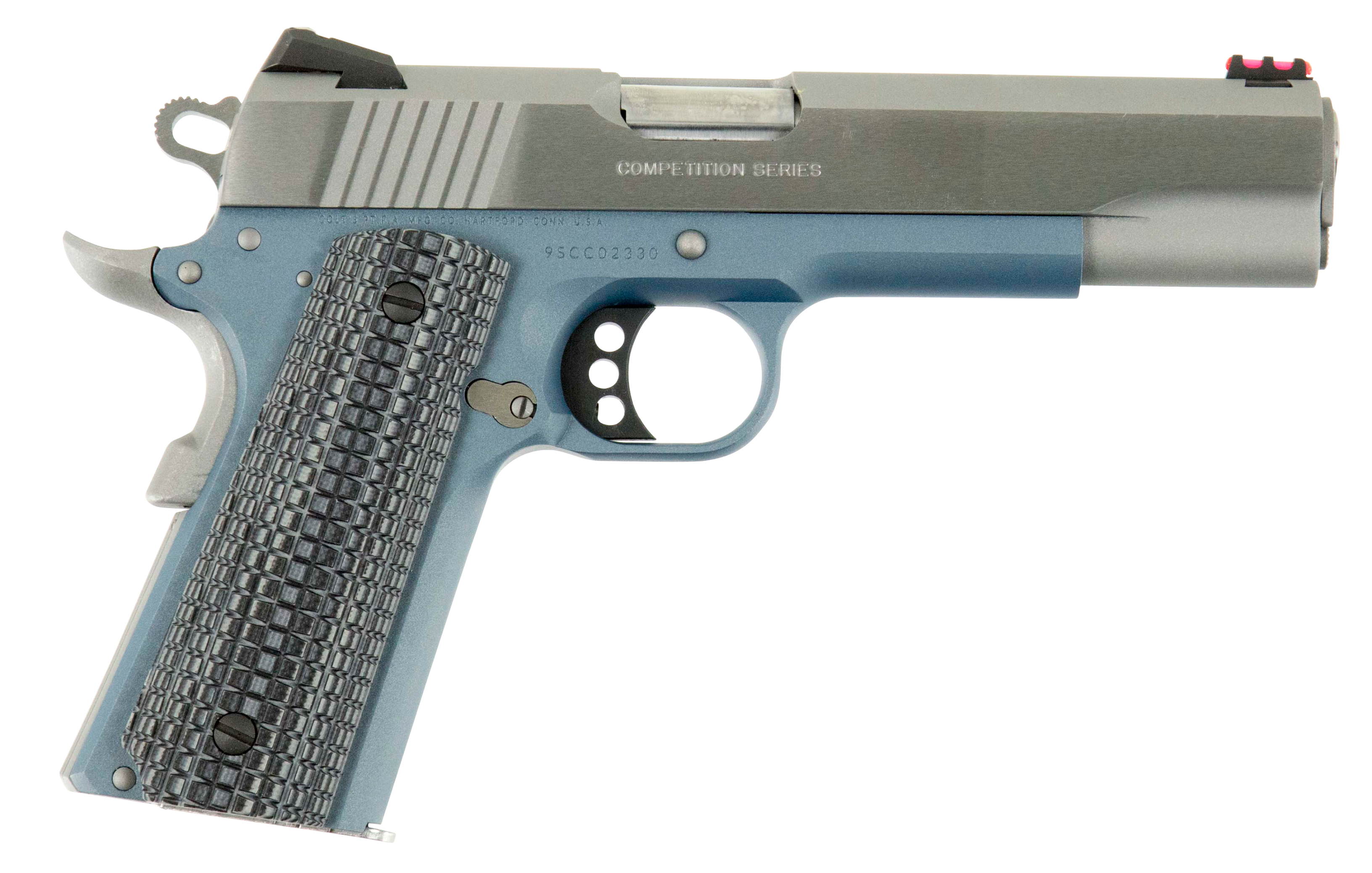 Colt's 1911 competition pistol features custom g10 blue grips with a scallop texture and the colt logo, dual recoil spring system, and national match barrel.It has novak sights for precision shooting with a fiber optic front with adjustable rear sight.It comes with a magazine and spare sight fibers.