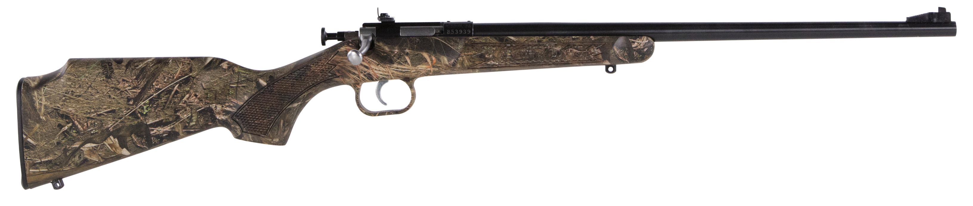 Crickett rifles are the staple of the youth shooting experience.A manual cocking, single-shot, bolt action, it features a rebounding firing pin safety to prevent accidental discharge, 2.5-3 lb.Trigger pull, 11.5" length of pull, and a 16.125" barrel.Crickett rifles have a fixed front sight, adjustable rear peep sight and are drilled and tapped to accept crickett scope mounts.This model has a synthetic mossy oak duck blind stock with a blued barrel.