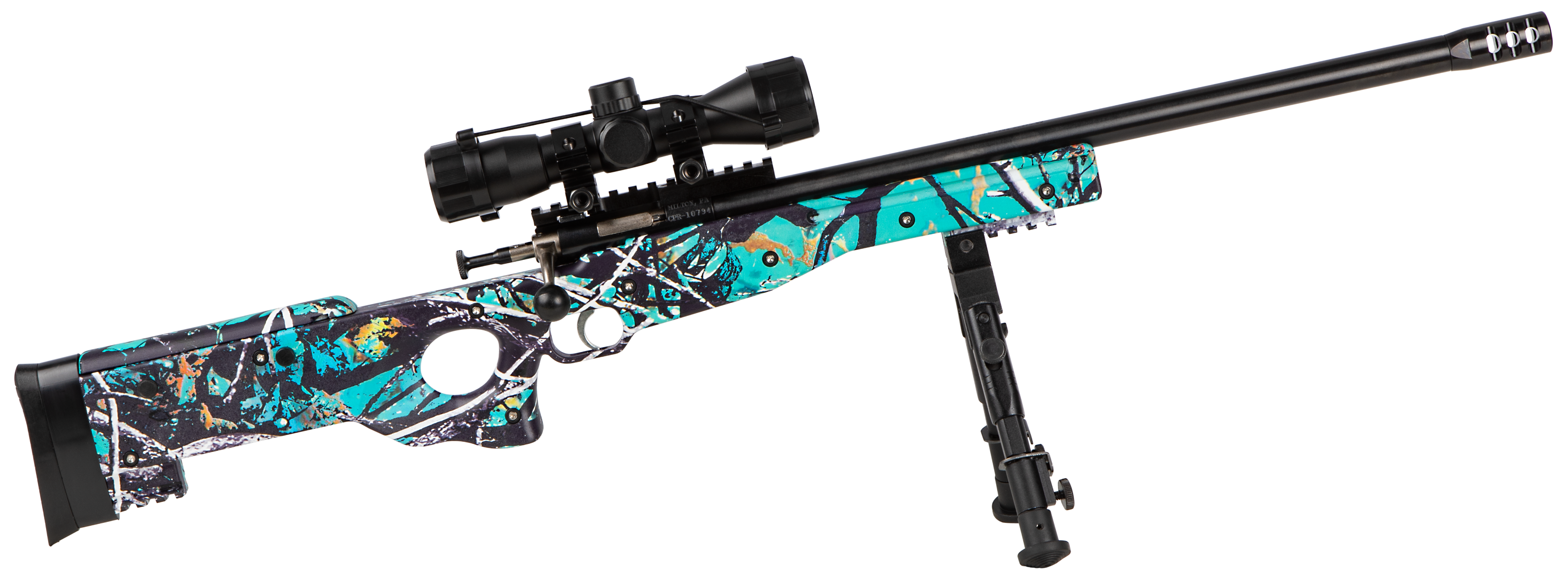 Metal Finish: Blued Action: Bolt Caliber: 22 LR Barrel Length: 16.13" Capacity: 1 Stock Description: Fixed Thumbhole Barrel Description: Bull Muzzle: Muzzle Brake Receiver Material: Steel Sights: None, Scope Barrel Length Range: 16" to 16.99" Hand: Right Stock Finish Group: Natural Camouflage Metal Finish Group: Blued/Black
