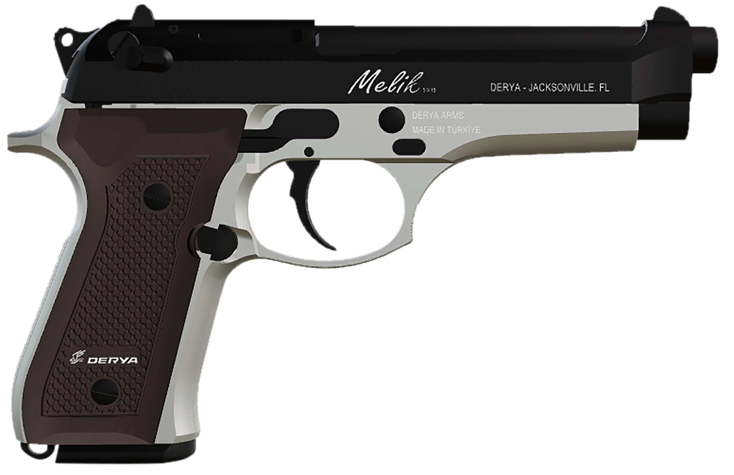 The derya melik 9mm pistol now features an elegant two-tone finish with its silver aluminum frame contrasting against a black melonite steel slide.The dark walnut grip provides a comfortable, ergonomic hold for the shooter.Designed with a double/single action and equipped with fixed sights for accuracy.Includes a hard case, user manual, wtta flyer, high-capacity magazine, cleaning rod and gun brush.