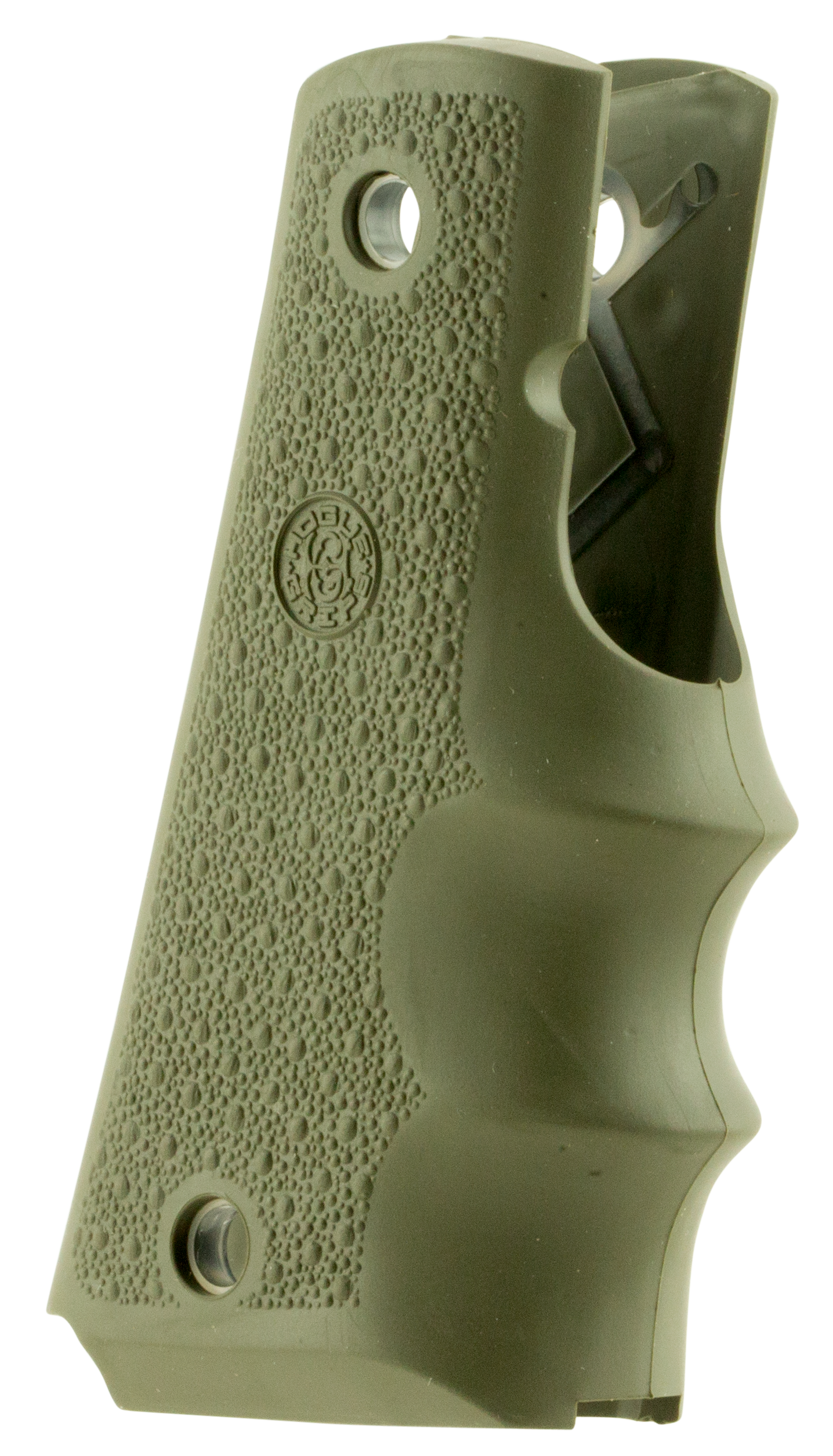 Hogue rubber grips are molded from durable synthetic rubber that is not spongy or tacky, yet provides a soft recoil absorbing feel without affecting accuracy.The flexibility of the materials and molding process produces rubber grips with features that out perform all other makes.It is molded with a reinforcing insert directly engaging with the firearm frame for a rock-solid grip-to-frame fit.The cobblestone texture provides an efficient non-slip, non-irritating stippling pattern.This model has an od green finish and is compatible with 1911 government.