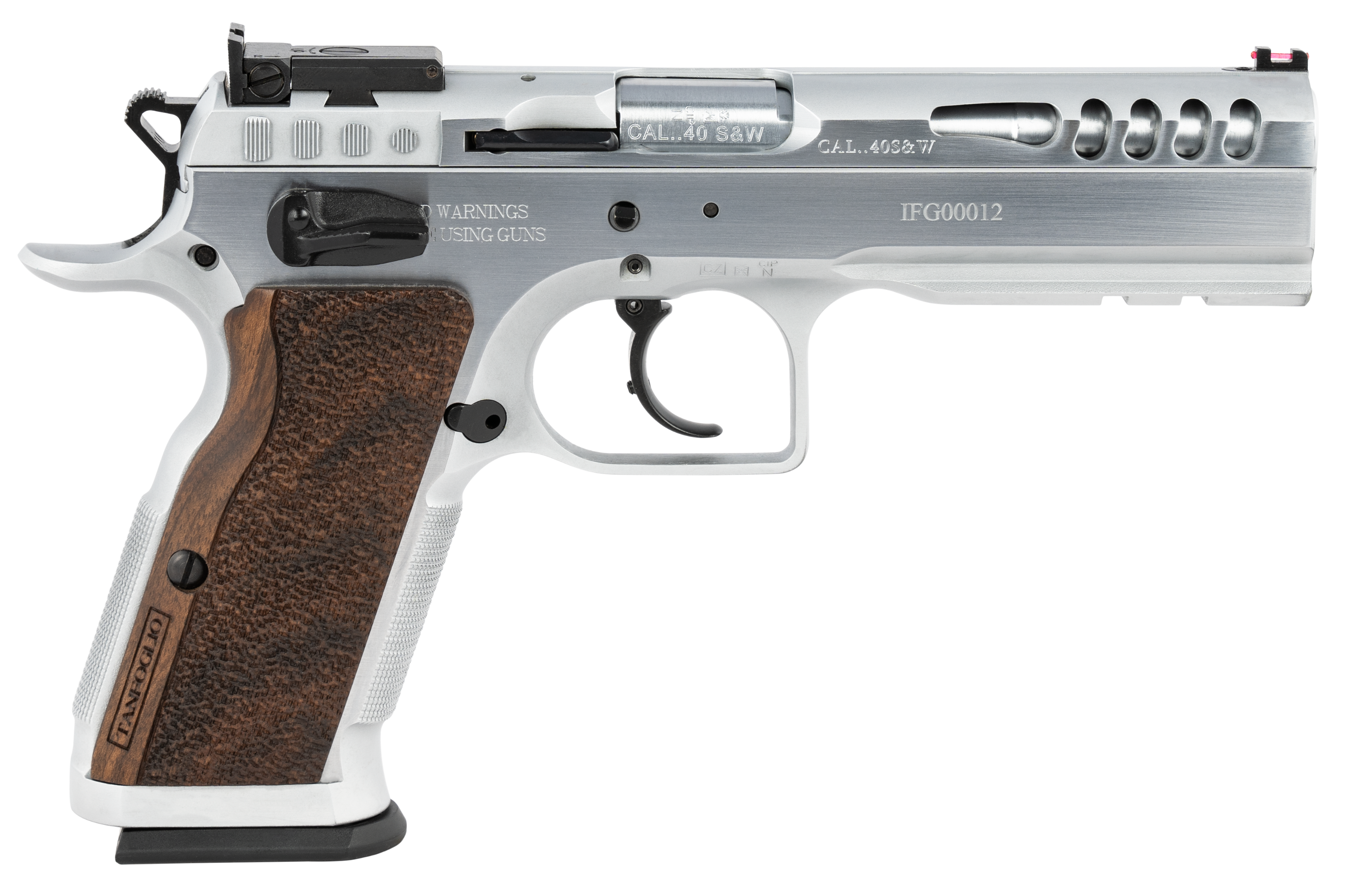 Frame Finish: Hard Chrome Action: SA/DA Caliber: 40 S&W Barrel Length: 4.75" Capacity: 14+1 Safety: Ambidextrous Extended Thumb Grips: Wood Sight Configuration: Adjustable Slide Description: Hard Chrome