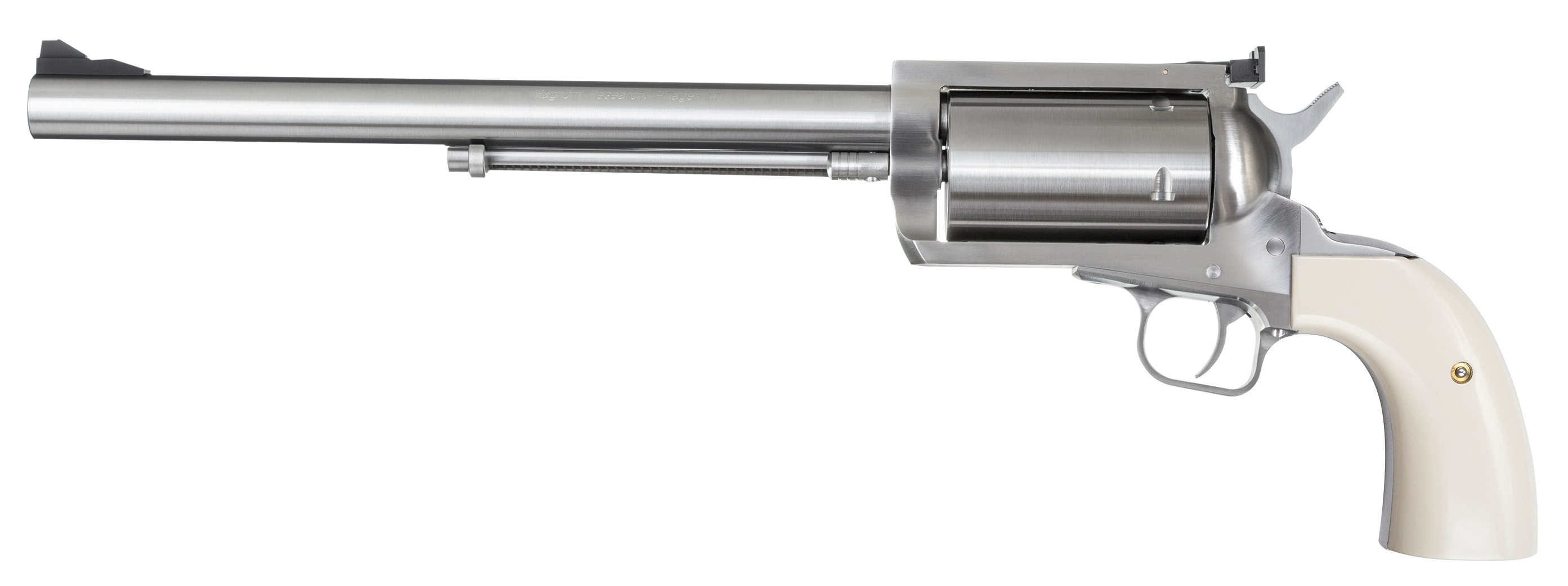 Frame Description: Stainless Steel Type: Revolver Action: SAO Caliber: 500 S&W Barrel Length: 10" Capacity: 5rd Hammer Style: Exposed Grips: Bisley White Laminate Sights: Black Fixed Front, Adjustable Rear Weight: 75.20 oz Frame Size: Extra Large Cylinder Finish: Stainless Barrel Finish: Stainless Oal: 17.50" Includes: Weaver Scope Mount Barrel Length Range: 10" to 10.99" Weight Range: 64 oz to 79.99 oz
