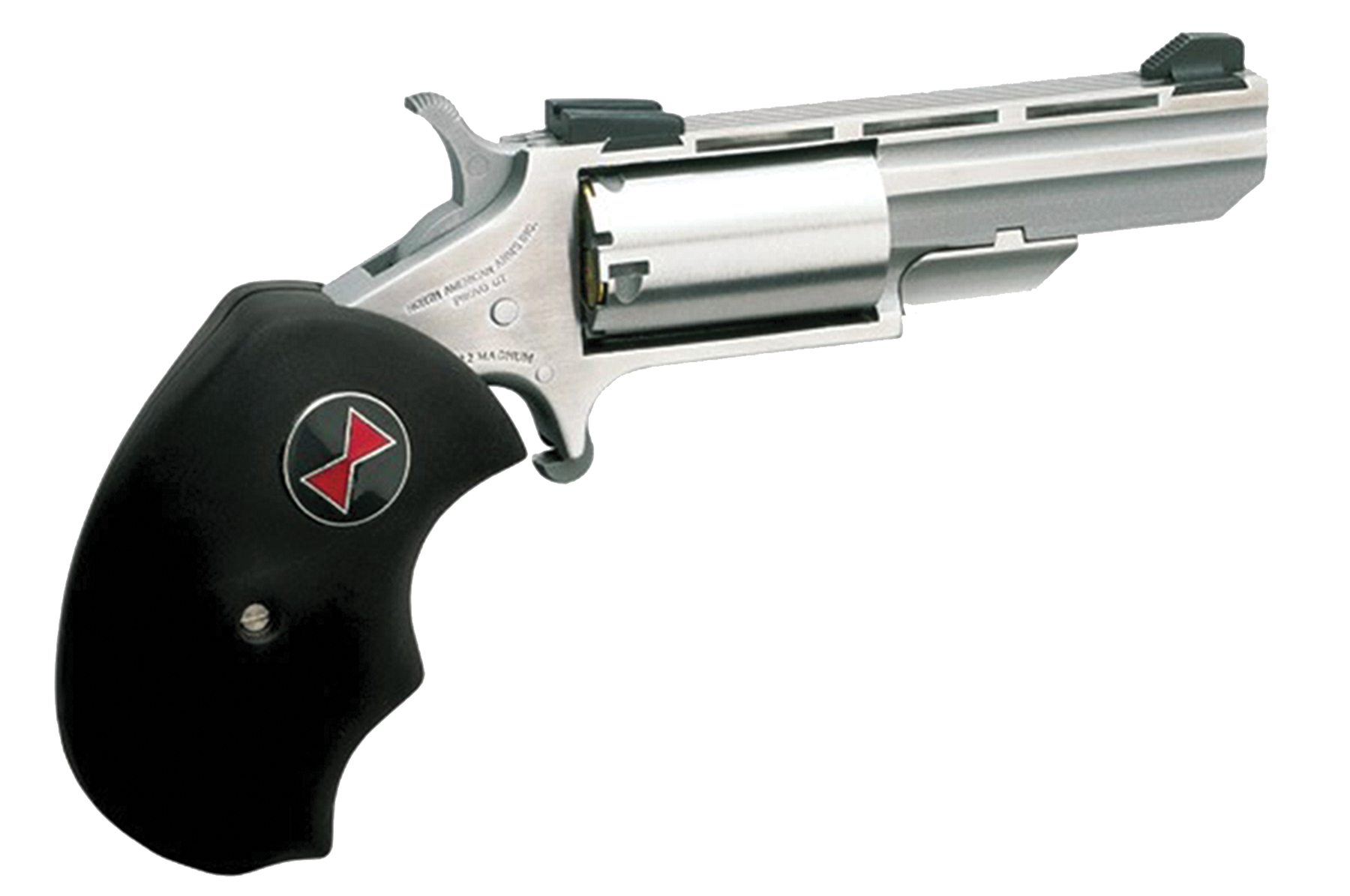 Black widow revolvers evolved from naa's popular.22 magnum frame series and include the time tested design characteristics that are incorporated in all naa mini revolvers.The result is enhanced stability and accuracy for the shooter.The black widow has a heavy 2" vent barrel, bull cylinder and marble arms fixed sights.The black widow also features oversized black rubber grips sporting the iconic red hourglass shape found on its namesake.