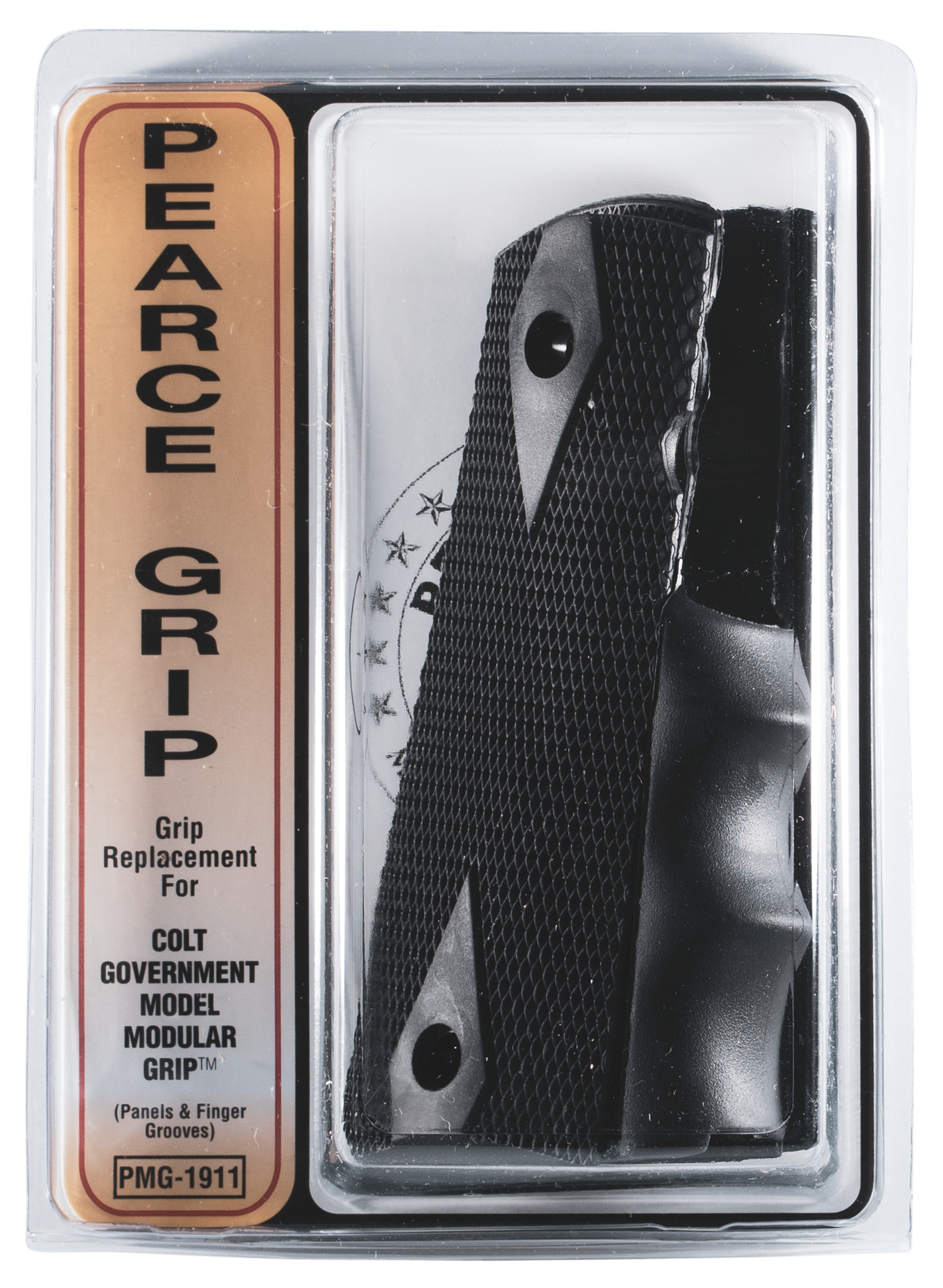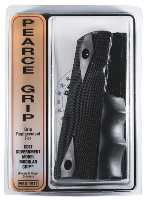 The modular system is made up of 1 finger groove insert (pg1911-1) and 1 side panel grip (pg1911-2).This all-rubber grip system provides a secure and more repeatable grip on the government model 1911.The ultra slim black rubber side panel has a slight palm swell giving the user a more positive hold while reducing the overall width.It has the classic double diamond checkering pattern of the 1911 government model.The finger groove insert fits under any gm 1911 side panel grip adding rubber front finger grooves for comfort and better handling.The side portion of the grip is only 1mm thick, so the overall width is only minimally affected.