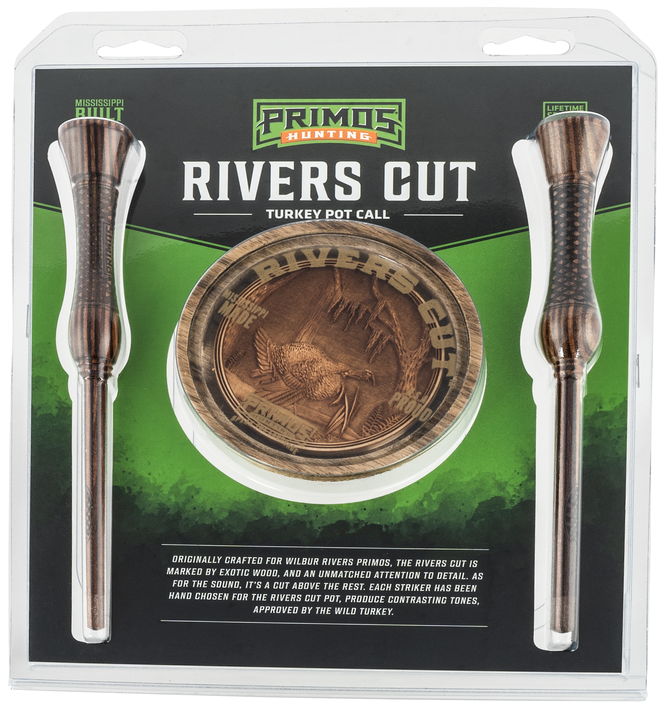 Proven on the wild turkey, the primos brings you the rivers cut pot call.Crafted from the most exotic woods, detailed with intricate engraving, and finished with a premium glass surface, the rivers cut finds its home in the woods or on the mantle.Originally designed for wilbur rivers primos, the rivers cut proudly bears his name, and creates a sound only carefully selected hardwoods can produce.Tailor-made specifically for the rivers cut pot, come two strikers, each chosen to create a distinct tone.Both strikers hold a cut knurled guide made for the perfect finger placement while calling.