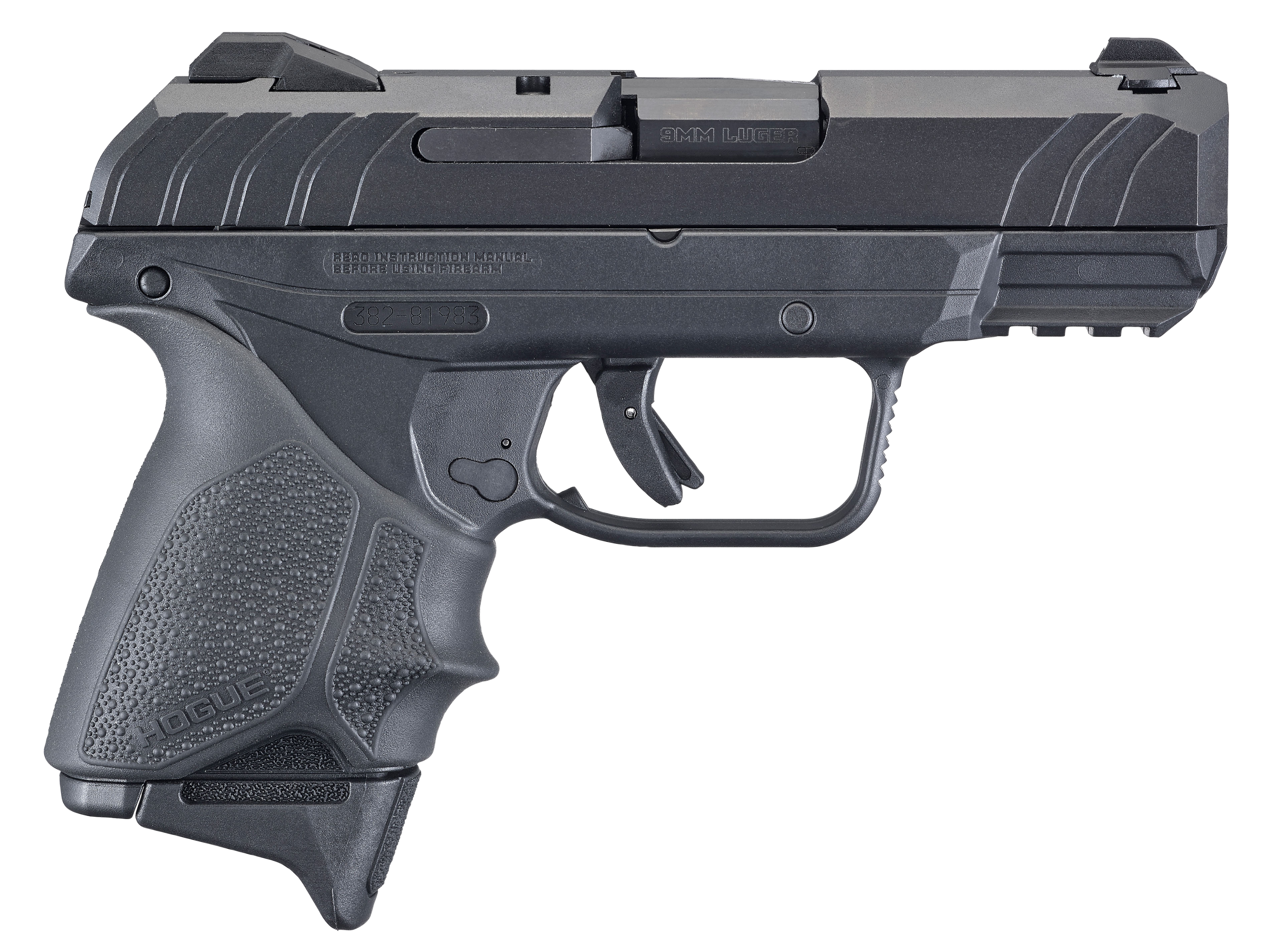 The ruger security-9 is compact for easy concealment and is designed to fit a variety of holsters.Made with a hardened alloy steel slide and barrel and glass filled nylon grip frame.The hogue beavertail handall grip sleeve with cobblestone texturing, finger grooves and palm swells provides a secure and comfortable grip.Dovetailed, high-visibility sight system with drift adjustable rear sight and fixed front sight.Safety features include integrated trigger safety; external manual safety; neutrally balanced sear with significant engagement and strong spring tension; and hammer catch to help prevent the hammer from contacting the firing pin unless the trigger is pulled.Includes two alloy steel magazines.