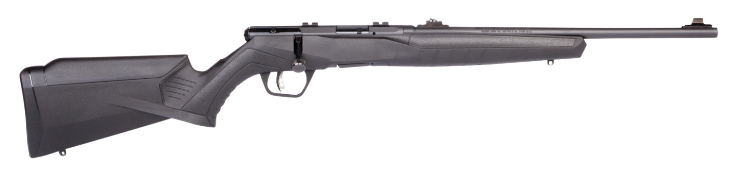 Savage arms b series is a bolt-action rimfire rifle.It features an ergonomically designed stock, higher comb, top tang safety and target style, and vertical pistol grip.The b series rifle also has a 10-round rotary magazine and the accuracy-boosting adjustable accutrigger.This compact model has a carbon steel 18" blued barrel and synthetic black stock.