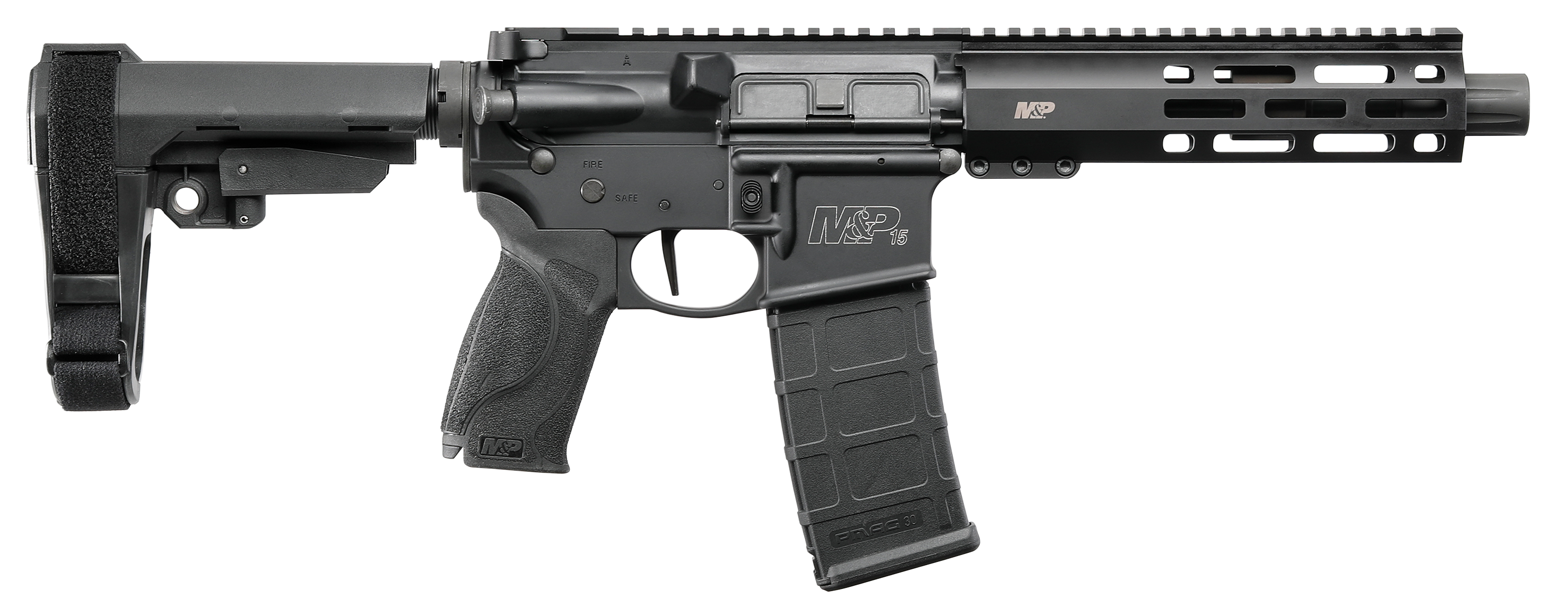 The m&p15 pistol features a hodge rail free-float handguard with m-lok slots, adjustable arm brace, four interchangeable palmswell grip inserts and a full length picatinny-style rail, one-point qd sling swivel attachment point and a threaded barrel with a blast diverter.