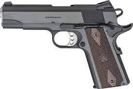 Springfield Garrison, 1911, Single Action Only, Semi-automatic, Metal Frame Pistol, Commander Size, 45 Acp, 4.25" Match Grade Barrel, Steel, Blued Finish, Black, Thinline Wood Grips, Low Profile Combat 3 Dot Sights, Grip Safety, 7 Rounds, 1 Magazine Px9418