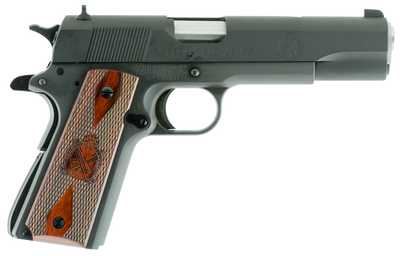 Frame Finish: Black Parkerized Type: Pistol Action: SAO Caliber: 45 ACP Barrel Length: 5" Capacity: 7+1 Safety: Ambidextrous Manual Grips: Crossed Cannon Cocobolo Sight Configuration: 3-Dot Fixed Combat Weight: 39 oz Frame Material: Carbon Steel Barrel Type: Stainless Steel Match Grade Slide Description: Black Parkerized Carbon Steel Sight Style: Contrast Barrel Length Range: 5.00" to 5.99" Weight Range: 32.00 oz to 47.99 oz
