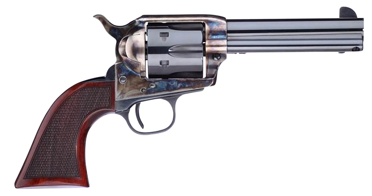 Taylors and company has reproduced the short stroke smoke wagon in.45 long colt.This pistol comes with a 4-3/4" barrel and has been custom taylor tuned and is a short stroke improved single action.Featuring a case hardened frame and blue finish with a richly detailed checkered navy grip for comfort and improved aim.This taylor tuned model has a trigger pull set at 3 pounds and features one of the smoothest hammer and trigger pulls on the market.Widened sight channel and widened front blade sight with a 6 cartridge cylinder and weighing 2.27lbs.