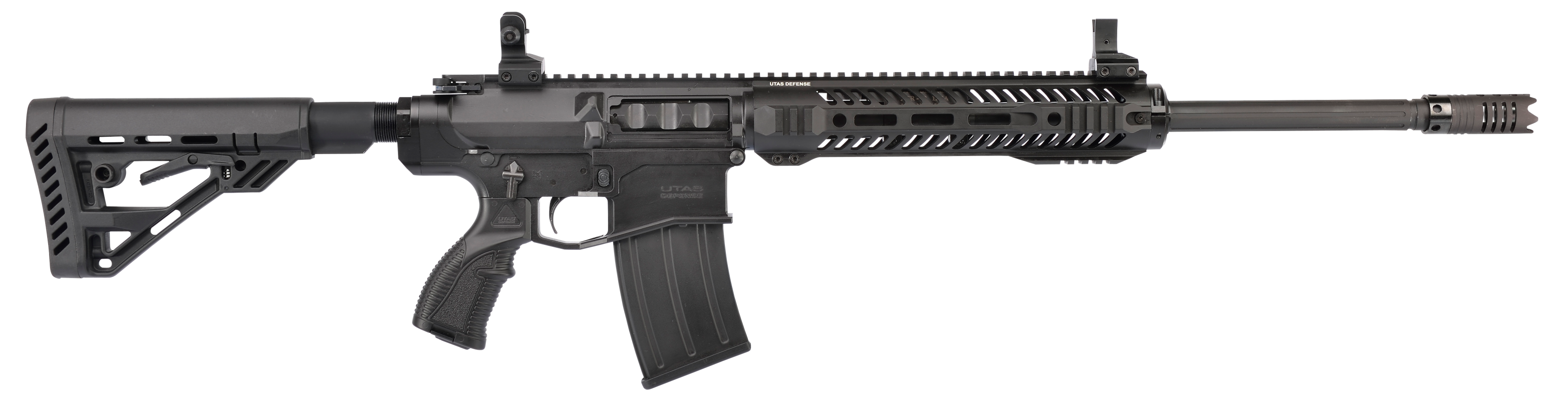The xtr-12 from utas is a semi-automatic shotgun with a heat-treated barrel and a threaded muzzle to accept multi chokes.It features a gas operated/rotating bolt system, 4140 steel body and barrel with aluminum receivers.The handguard features integrated picatinny quad rail sections for iron sights and optics, and couples with the flattop upper for a monolithic, optic-ready top rail.The xtr-12 has a five-position black synthetic telescopic stock with a recoil pad and an oal of 39.2".It includes one 5-round magazine.Please note: optics and muzzle devices are not included.This model has a black cerakote finish on the receiver and handguard with a black synthetic pistol grip with storage.